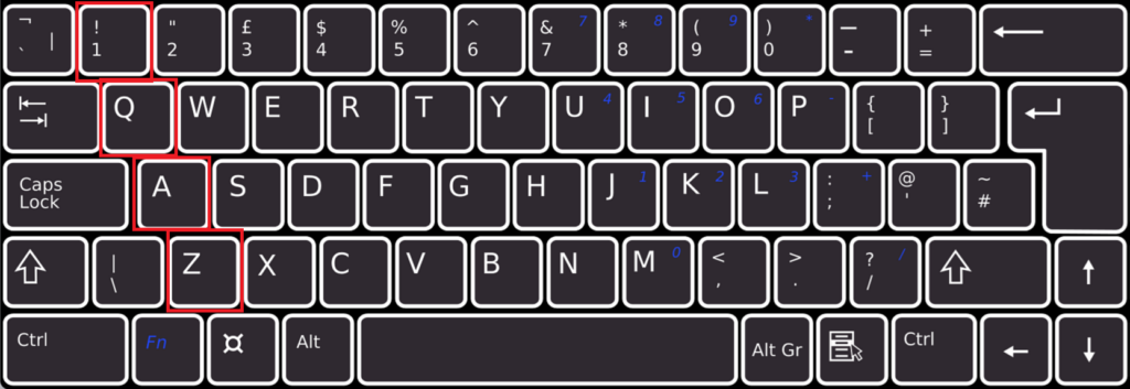「A / Q / Z / !」などは、本来は左手小指で押すキーですが、